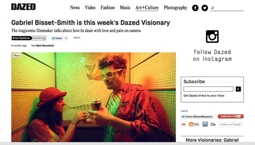 In 2014 Gabriel was named one of Dazed & Confused Magazines DAZED VISIONARIES alongside the likes of James Franco and Bjork. They then commissioned his film Toilets. You can find out more here: http://www.dazeddigital.com/visionaries-gabriel-bisset-smith